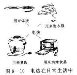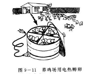 电热器是利用来加热的设备,电炉、电烙铁、电熨斗、电饭锅、电烤炉(图9-10)等都是常见的电热器。电热器的主要组成部分是发热体。发热体是由电阻率大、熔点高的电阻丝烧在绝缘材料上做成的。电流通过电阻丝发出热量,供人们利用,电热器清洁卫生,没有环境污染,热效率高,有的还可以方便地控制和调节调度,这些都是电热器的优点。供取暖用的电褥,烘干物品的电供箱,孵化家禽的电热孵器(图9-11),引发炸药的电热装置,高空飞行员所穿衣服里的电热保温装置等等,都是电热器。它们的构造和用途不同,原理都是一样的。