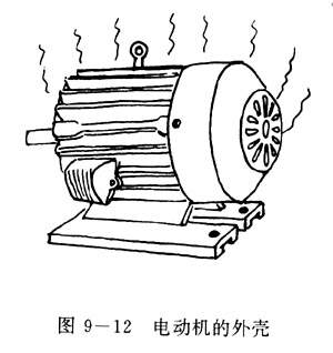 在电动机里,电流所做的功主要用来做机械功,但电动机里的导线有电阻,也要产生热量,使导线的温度升高。温度超过绝缘材料的耐热温度,绝缘材料会迅速老化,甚至可能烧坏,这就需要考虑如何加快散热。有的电动机里装有风扇,电动机的外壳作成如图9-12所示的形状,都是为了加快散热。