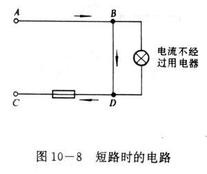 怎样解释上述现象呢?在B、D间连上导线,造浅路后,电路中形成两条支路(图10-8):一条支路是B、D问的导线,另一条是电灯所在的支路。B、D间导线的电阻很小,这时并联电路的总电阻也很小,因此,干路中的电流很大,连在干路中的保险丝被熔断。从并联电路两条支路中的电流分配情况知道。这时绝大部分电流经过B、D问的导线,可以认为电流设有经过用电器。因比,所谓短路就是电流设有经过用电器而直接构成通路。