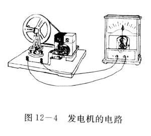 如图12-4所示,把手摇发电机和演示电流表连接起来,组成闭合电路,缓慢遥播转大轮,带动线圈在磁场里转动,可以看到演示电流表的指针左右摇动起来。